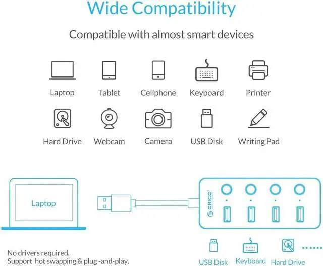 ORICO USB 3.0 hub supports USB 2.0 and USB 1.0 connections, so it is compatible with almost every portable devices.