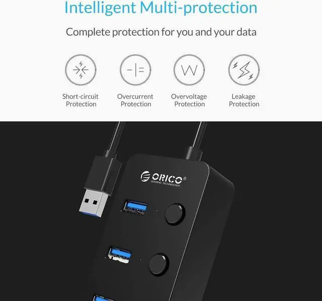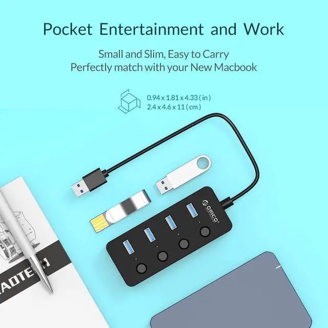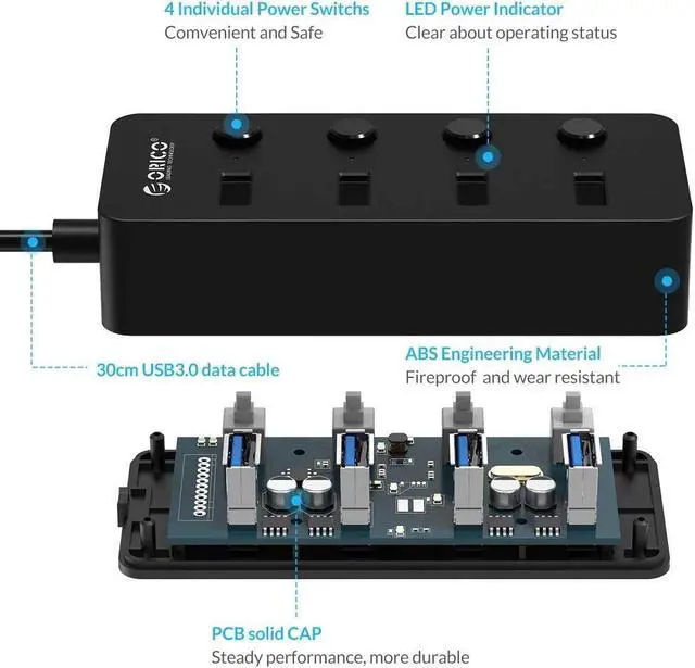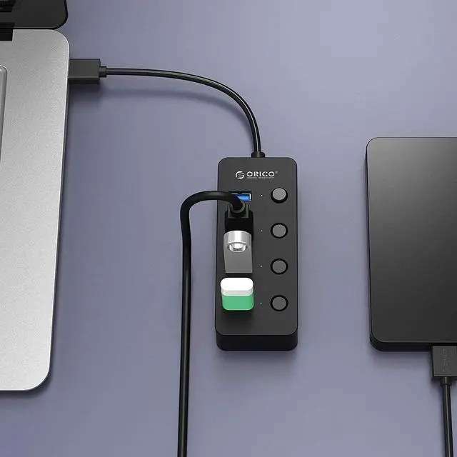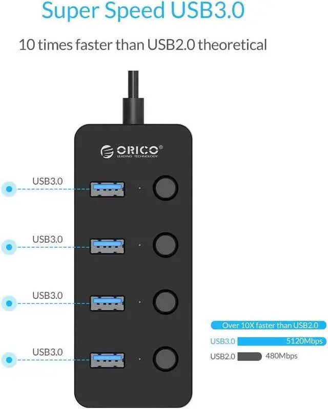 ORICO USB 3.0 hub has nice compact size with multiple plugs. Each port is equipped with Individual Power Switch and LED to manager individual status.