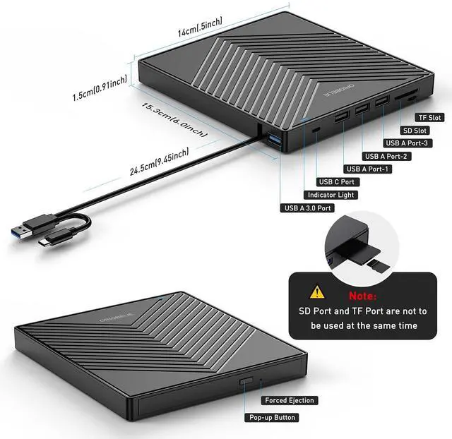 It is not only CD/DVD burner, but also a SD/TF card Reader. Extra built-in SD/TF card slot is perfect for you to transfer photos shooting or videos by your camera from memory cards to your computers