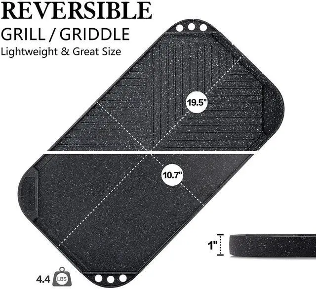 - Extra-large Cooking Surface-This stovetop griddle comes in at 19.5 inches by 10 and a half inches, it provides a large cooking surface for cooking large meals. The weight is 4.4 pounds, that is lightweight than cast iron, so you can easy to lift, flip or hang when not in use.