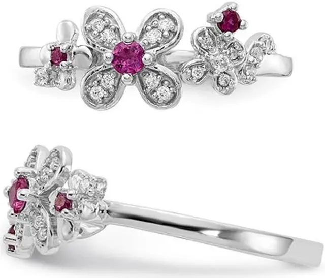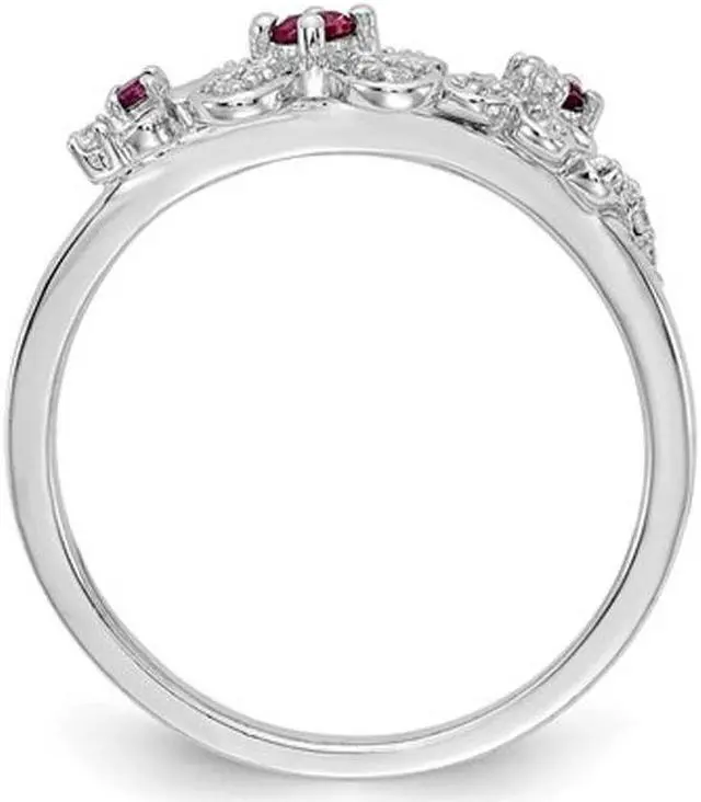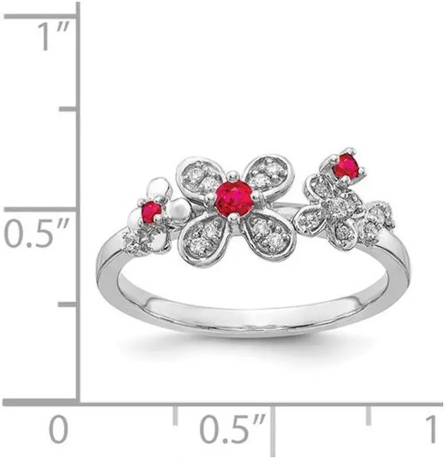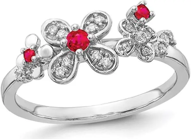 Rich red brilliant round rubies 1/8 carat (ctw) are surrounded 18 accent diamonds sparkling along a flower petal motif in a prong set crisp polished 14 karat white gold foundation.