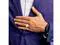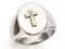 Polished strong stainless steel is created into a signet style ring with 10 karat yellow gold cross across the top.
