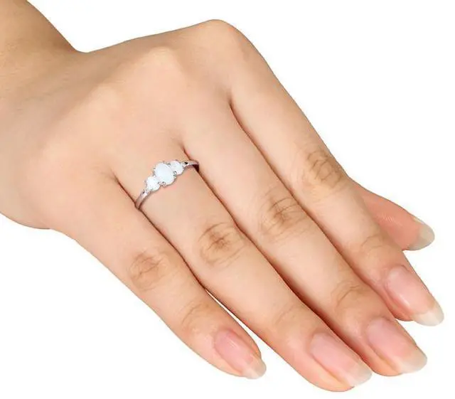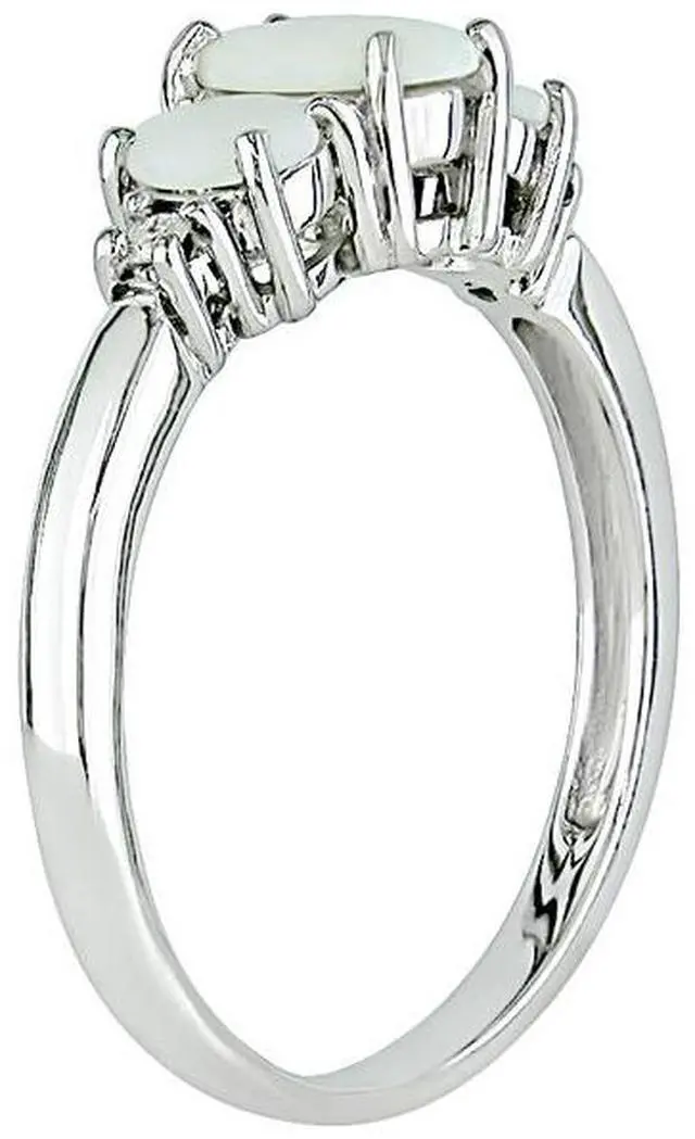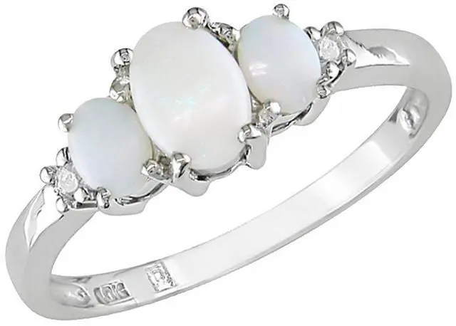 This gorgeous three stone ring shines with over 0.40 carats (ctw) of shimmering opals and accent diamonds. Set in polished 10 karat white gold, this ring makes a lovely gift for those celebrating October birthdays.