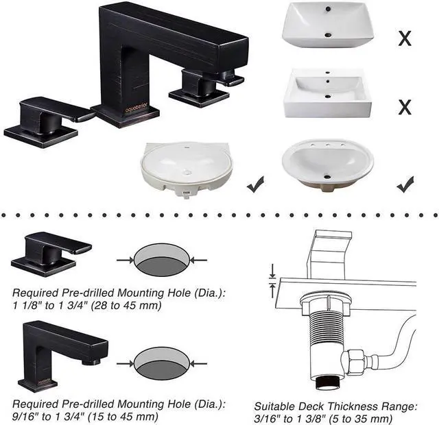 - Required Pre-drilled Mounting Hole (for Faucet) (Dia.): 9/16" to 1 3/4" (15 to 45 mm)
