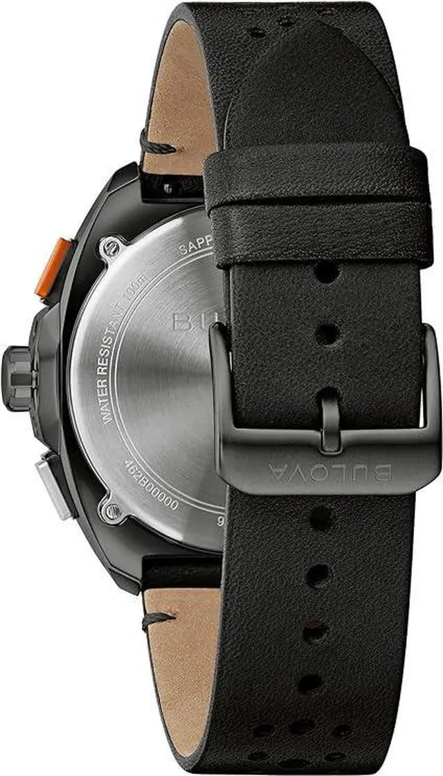 Case Material- Stainless Steel (Contoured Black IP Round). Case Diameter- 42 mm. Case Thickness- 13.1 mm. Band Material- Perforated Leather (Racing-style). Band Color- Black. Band Width- 22 mm. Dial- Black 5-Hand Chronograph Orange and White racing pattern chapter ring Black Subdials. Crystal- Sapphire Crystal. Bezel- Two-tone Orange and Black Tachymeter Ring. Movement- Quartz Analog. Clasp- Pin Buckle. Water Resistance- 100 meters. Functions- Chronograph Minutes Subdial 24-Hour Time Subdial Date Display (at 6 o clock) Bold Orange Chronograph Seconds Hand Super-Luminous material on hands/markers Pronounced Pushers. Design Theme- Motorsport/Automotive (Evokes aerodynamic curves).