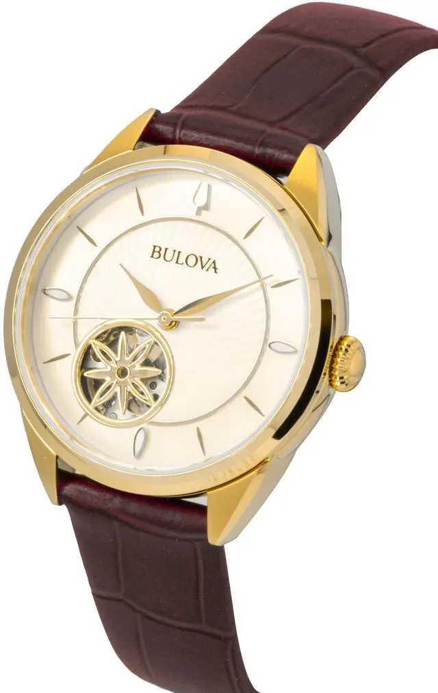 The Bulova Sutton 96L339 offers a captivating view into precision with its open-heart design, revealing the intricate automatic movement. This elegant womenâs watch features a beautiful mother-of-pearl dial, adding a touch of luxury to your wrist. The supple leather strap provides comfort for everyday wear, while the automatic movement ensures youâll always have reliable timekeeping without the need for batteries. With its sophisticated style and exceptional craftsmanship, the 96L339 is a perfect blend of beauty, functionality, and precision for the modern woman who appreciates timeless design.