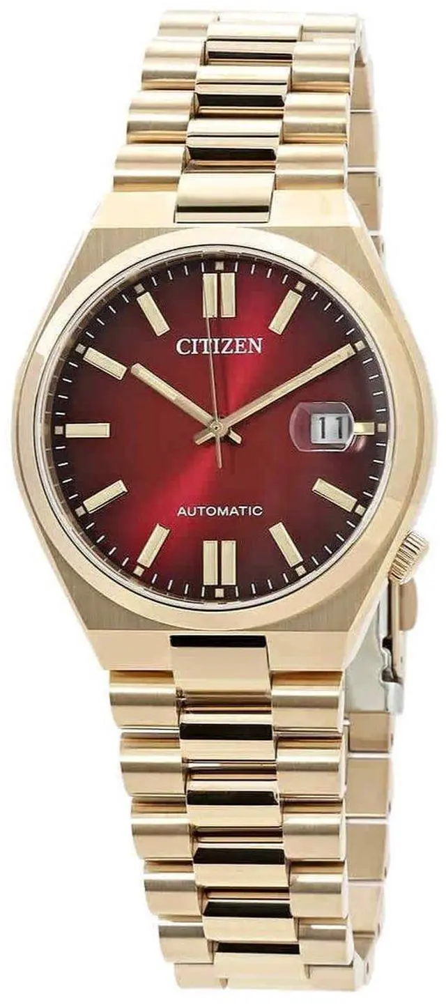 The Citizen NJ0153-82X captivates with its deep wine-red dial, a bold yet elegant statement that adds a touch of luxury to any wrist. Featuring a gold-tone stainless steel case and bracelet, this timepiece combines classic sophistication with modern craftsmanship. Powered by an automatic movement, it offers dependable, battery-free performance, while the date display adds a functional edge. The watchâs refined design and striking color palette make it the perfect accessory for those who appreciate both style and precision in their timepieces.
