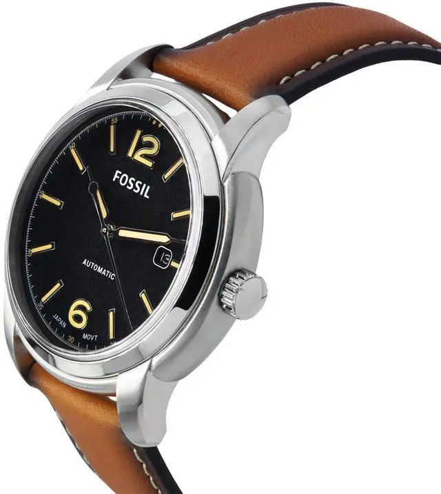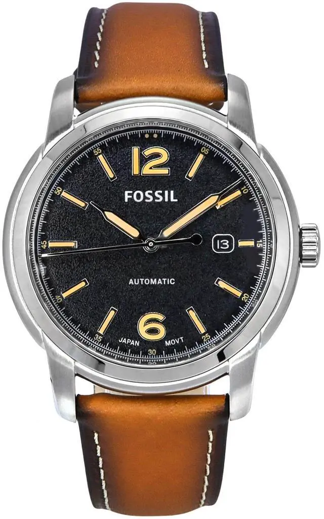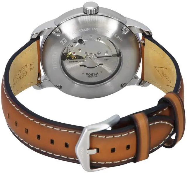 The Fossil ME3233 merges classic design with modern features. It boasts a stainless steel case and a brown leather strap, paired with a textured black dial. This watch is powered by an automatic movement with 21 jewels and protected by a sapphire crystal. Additional highlights include luminous hands and markers, a date display, see-through case back, and 50m water resistance, making it an ideal choice for everyday sophistication.