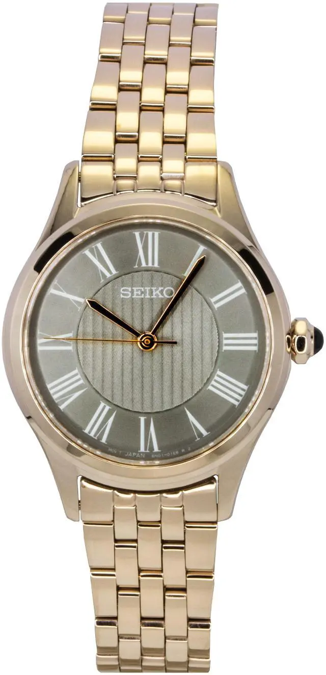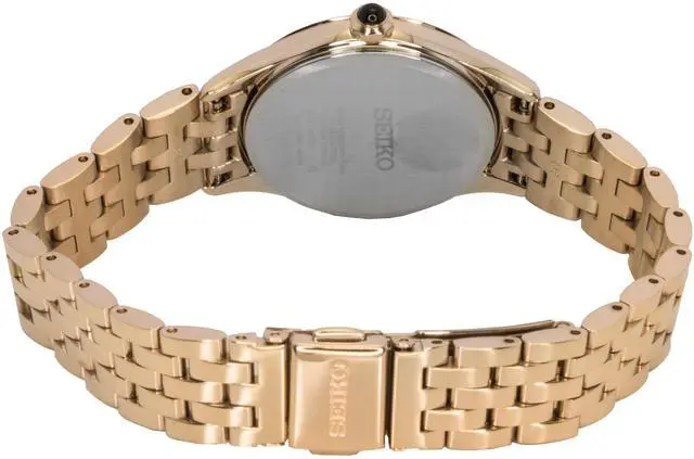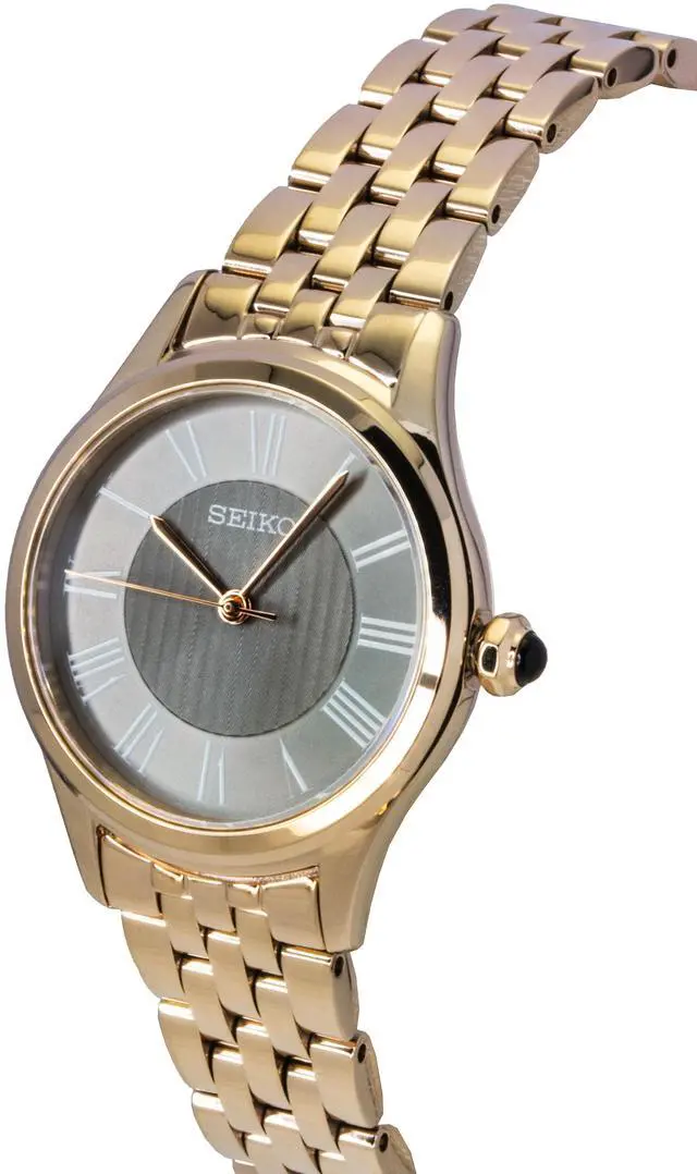 Seiko SUR614P1 exudes elegance with its stunning rose gold stainless steel case and sophisticated grey dial. Powered by reliable quartz movement, this womenâs watch ensures precise timekeeping, while the elegant design offers a refined aesthetic suitable for both everyday wear and special occasions. The minimalist dial and durable stainless steel construction provide both style and durability, making it an ideal accessory for those who appreciate understated luxury. With its timeless design, the Seiko SUR614P1 is perfect for enhancing any wardrobe with effortless charm.