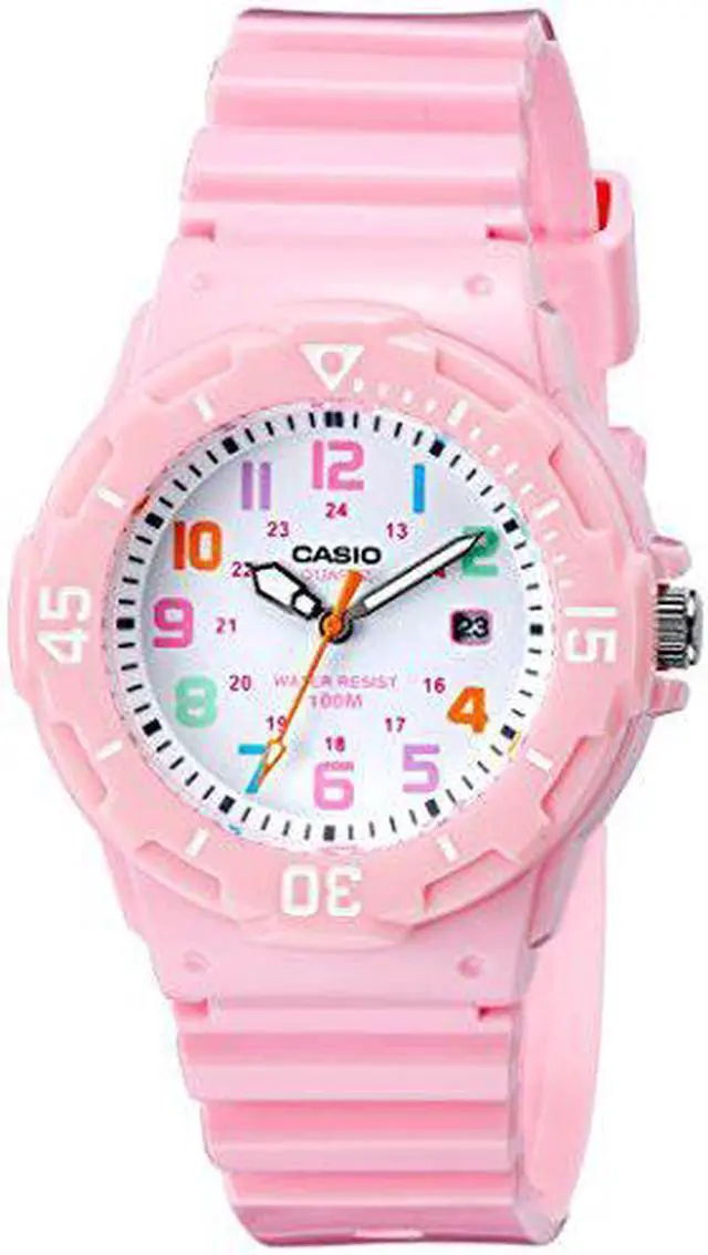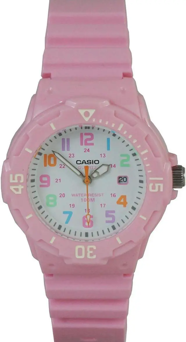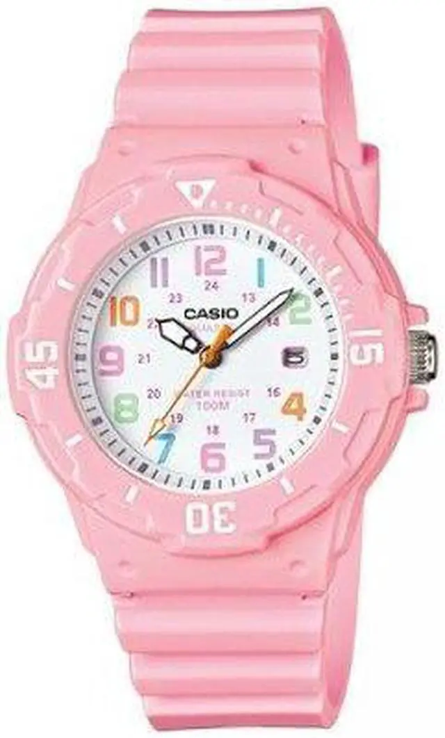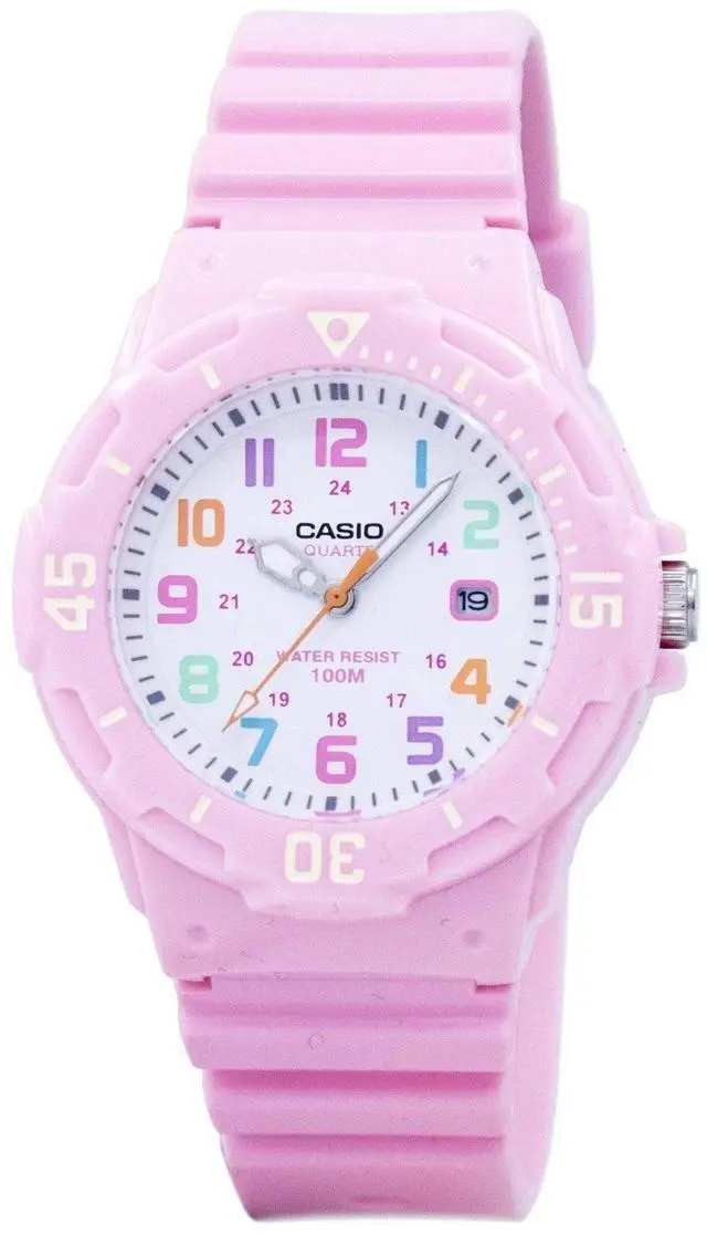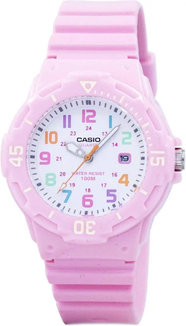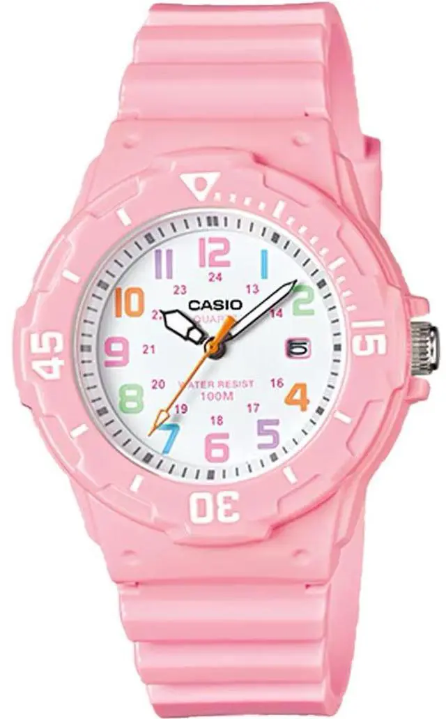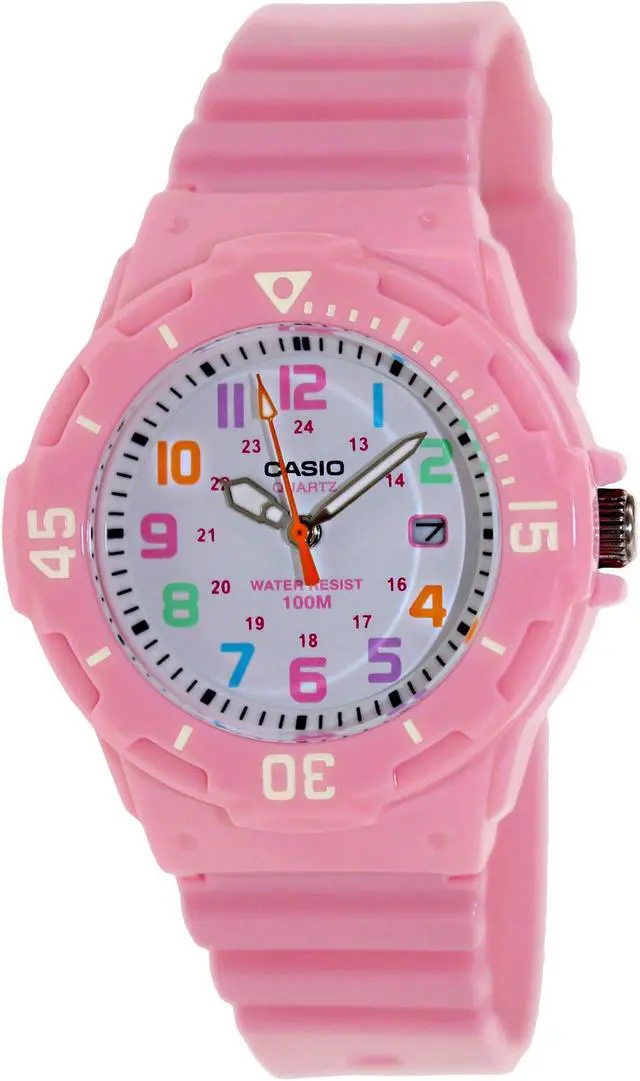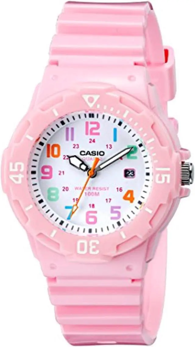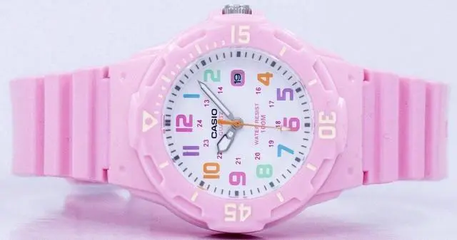 The Casio LRW-200H-4B2V is a womens analog watch that combines a playful design with practical features. It features a white dial adorned with multi-colored Arabic numerals, enhancing readability and adding a vibrant touch. The watch is equipped with a bi-directional rotating bezel, allowing for easy tracking of elapsed time. With a water resistance of up to 100 meters, its suitable for various water activities, including swimming and snorkeling. The timepiece is powered by a reliable quartz movement, ensuring accurate timekeeping. Additionally, it includes a date display at the 3 oclock position for added convenience.