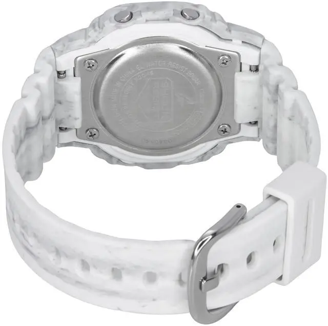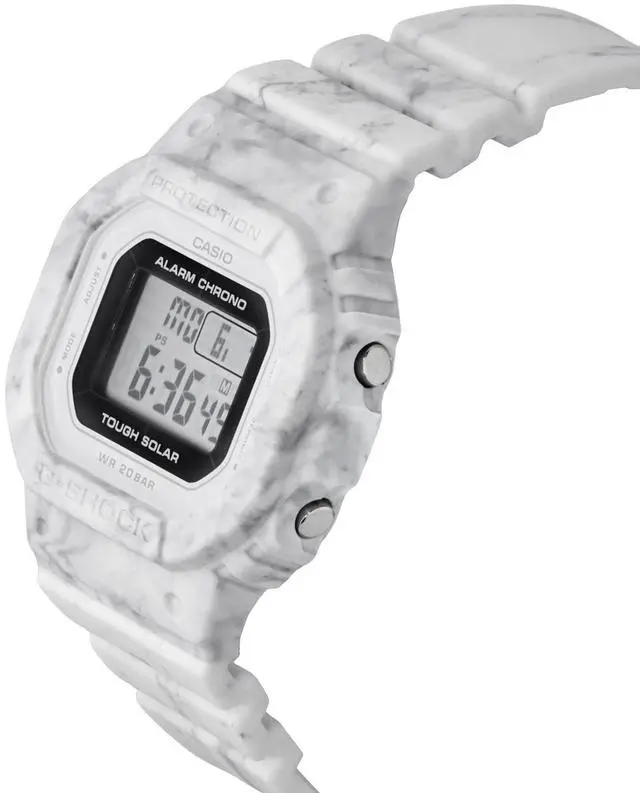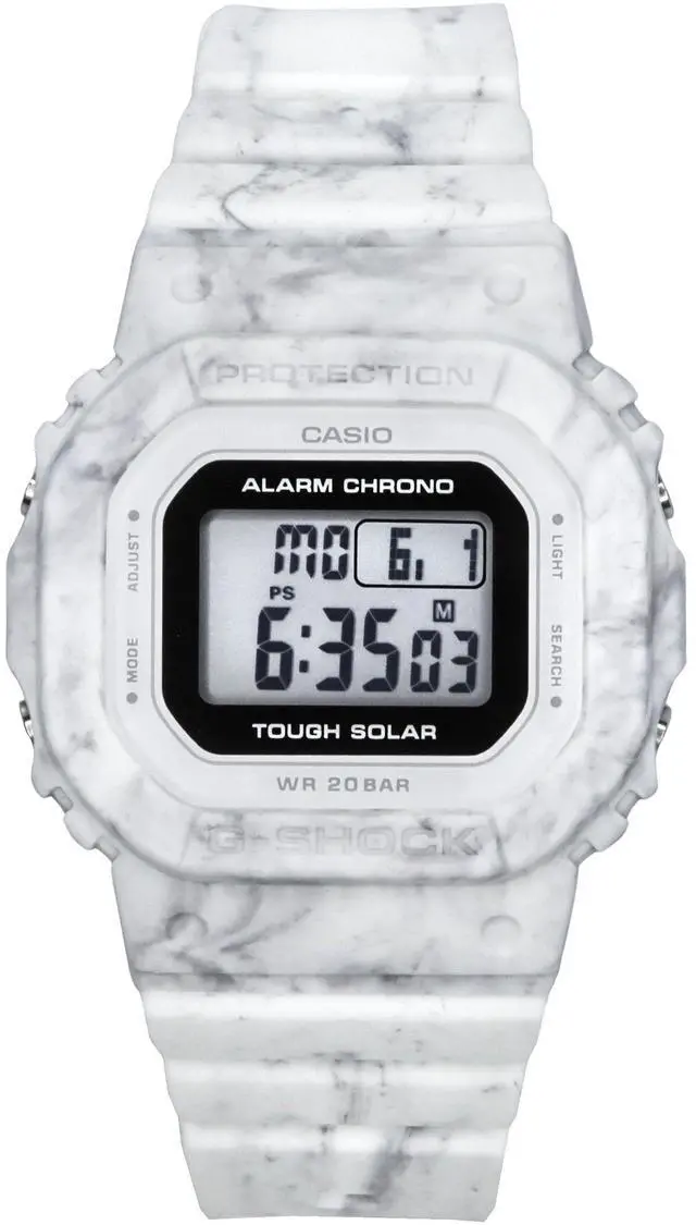 The Casio GMS-S5600RT-7 shines with its crisp white bio-based resin strap, blending eco-conscious materials with modern design. Powered by Tough Solar technology, it ensures consistent performance with minimal maintenance. The digital display offers essential functions such as alarms, stopwatch, and countdown timer, making it practical for everyday wear. With 200-meter water resistance and shock-resistant durability, this G-Shock model is perfect for active women who need a reliable yet stylish accessory. Combining sustainability and toughness, itâs designed for both adventure and elegance.