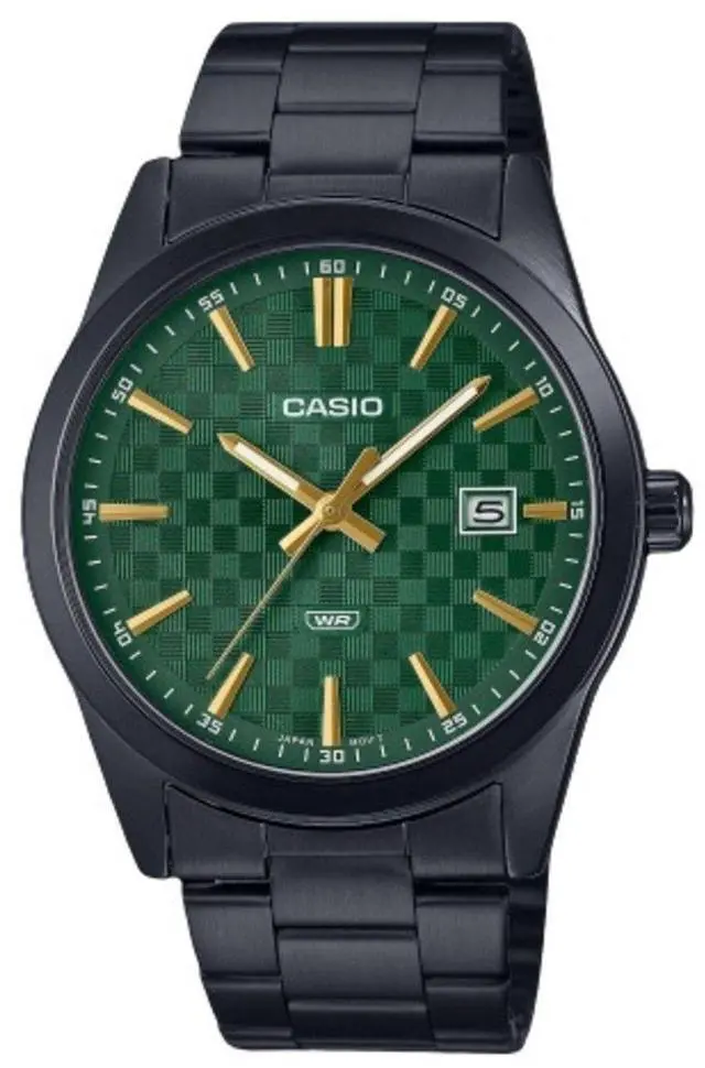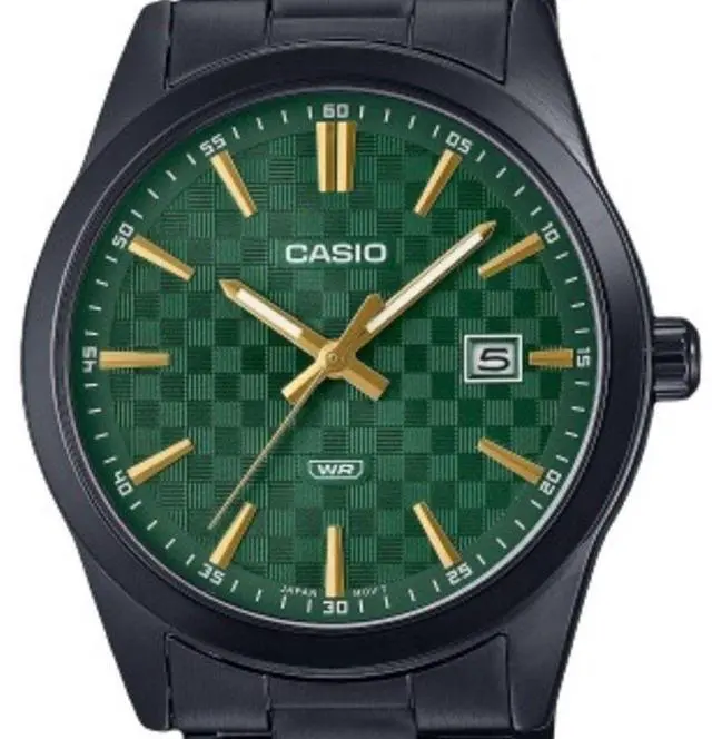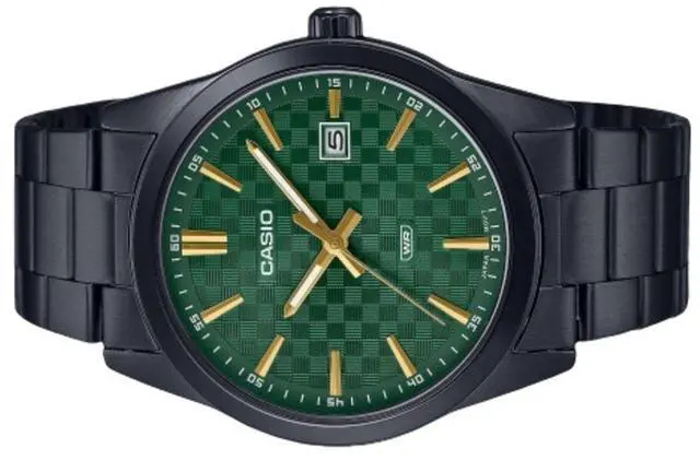 The Casio MTP-VD03B-3A showcases a captivating green dial that adds a modern edge to its design. Its ion-plated stainless steel case enhances durability and gives the watch a sleek, polished look. Powered by precise quartz movement, this timepiece ensures reliable timekeeping, while the comfortable strap makes it perfect for daily wear. With 50-meter water resistance, itâs suitable for everyday adventures, combining style and practicality for those who value functionality and fashion.