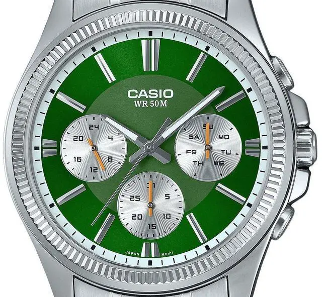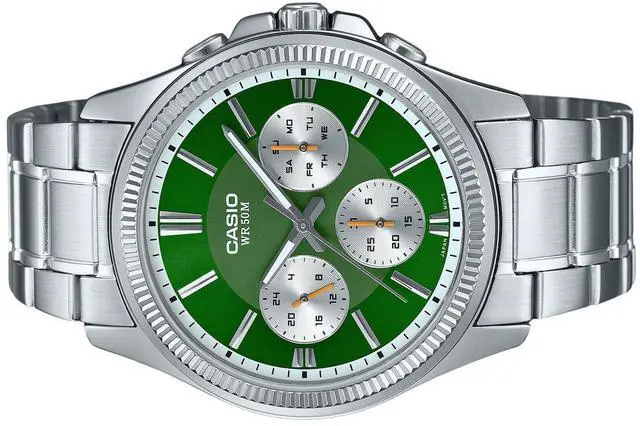 Stand out with the Casio MTP-1375D-3, featuring a striking green dial that adds a pop of color to your style. This analog watch combines sleek stainless steel construction with reliable quartz movement for precise timekeeping. The multifunctional sub-dials enhance its practicality, while the durable build ensures longevity. Perfect for both casual and formal wear, the Casio MTP-1375D-3 offers a stylish yet functional timepiece for everyday elegance.