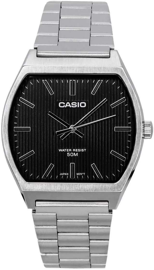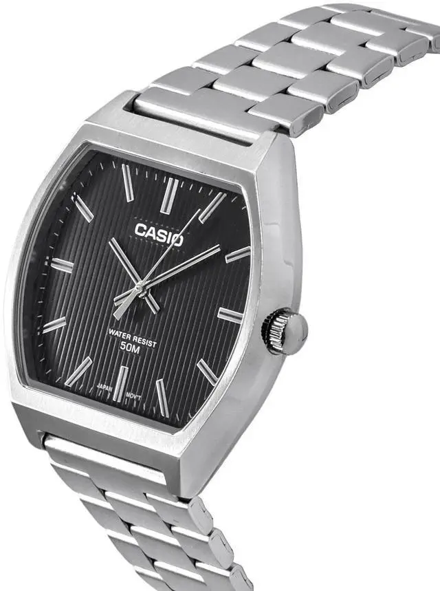 The Casio MTP-B140D-1A commands attention with its sleek black dial set against a robust stainless-steel case and band. This quartz timepiece showcases a minimalist design with an edge, perfect for those who value sophistication without excess. Its easy-to-read hands and hour markers ensure seamless time reading, while the stainless-steel bracelet adds timeless elegance and resilience, making it an ideal blend of function and fashion for everyday wear.