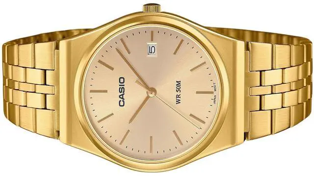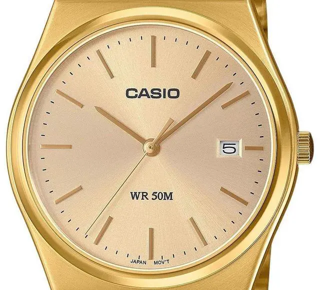 The Casio MTP-B145G-9AV features a gold tone stainless steel case and bracelet with gold ion plating. It has a quartz movement and is protected by a mineral crystal. The watch showcases a gold dial with an analog display and date display. The case measures approximately 35.00 mm in diameter and 07.40 mm in thickness. Additional features include a solid case back, deployment clasp, and 50M water resistance, combining elegance with practicality.