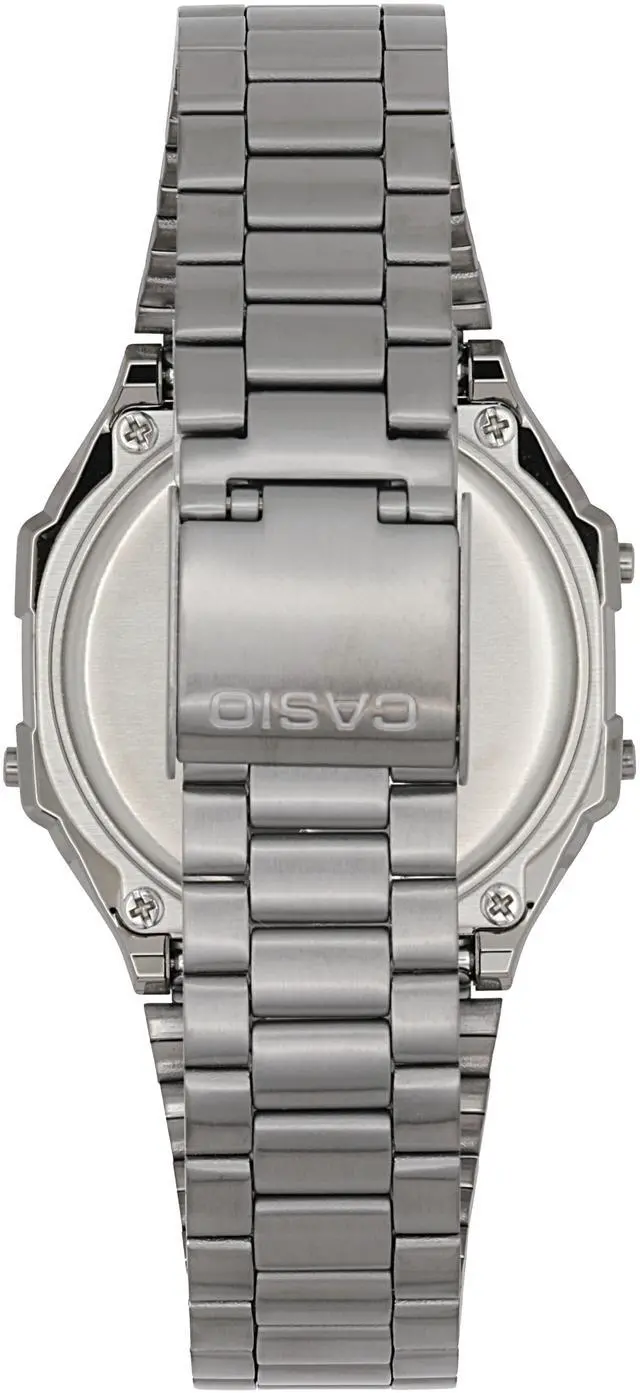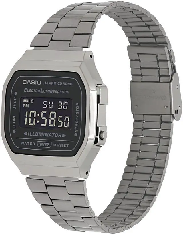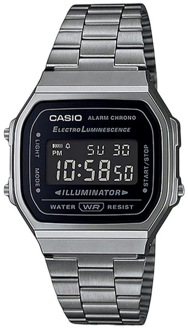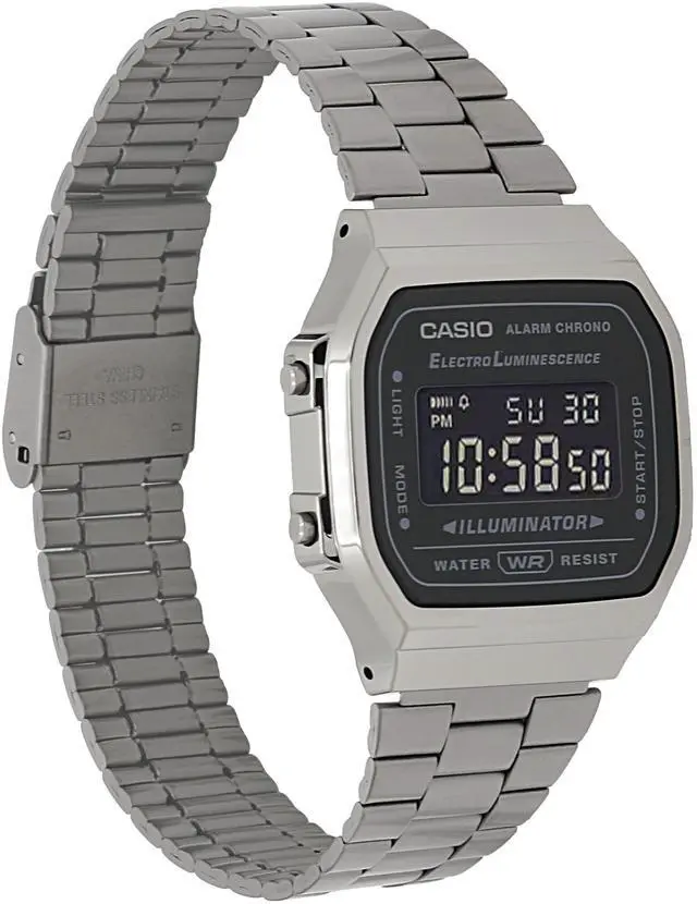 The Casio A168WGG-1B features a Quartz 3298 movement housed in a resin case with a stainless steel bracelet. The black dial with a digital display is protected by a resin crystal. Key features include a day and date display, gray ion plated band, hourly time signal, electro-luminescent backlight, 1/100-second stopwatch, daily alarm, and 12/24 hours display. Additional features are a screwed case back, deployment clasp, and splash resistance, combining functionality and style in a robust design.