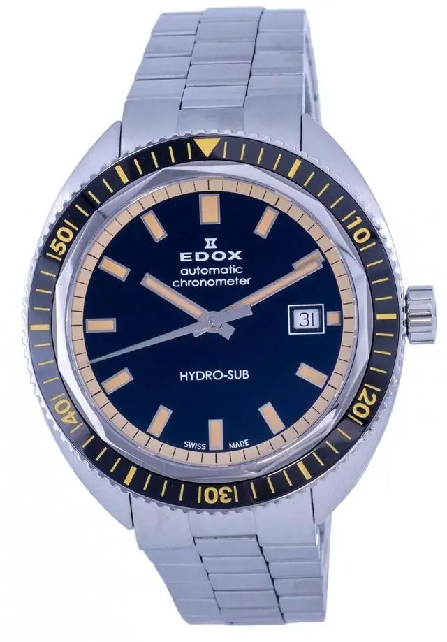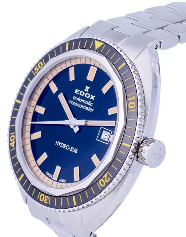 Edox Hydro-Sub Diver's Stainless Steel Black Dial Automatic 801283NBMNIB 80128 3NBM NIB 300M Men's Watch Edox Hydro-Sub returns from a six decade long hibernation to full glory with a Chronometer certification this time. It is a new design, stuffed with improved smarts - the screw-down crown and the double O-ring seal especially - have been retained and perfected suitable for the new millennium. The timeless Hydro-Sub still shows effortlessly through its new incarnation, on its way to become the Water Champion of the modern times as well.