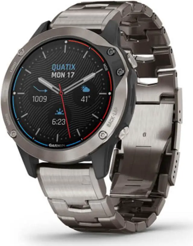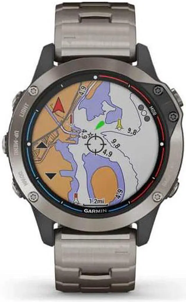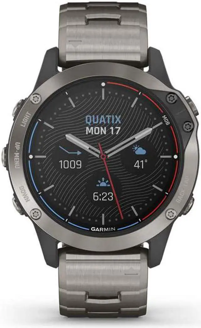 GARMIN quatix® 6 Titanium, Titanium Gray, with Titanium band, Comprehensive connectivity, Fusion-link ™ Audio system, Data streaming, Waypoint marketing, 10 ATM water rating, Abnormal heart rate alerts, Hydration monitoring, GPS, Compass, Accelerometer, Thermometer, GLONASS, and Galileo sensor GARMIN quatix® 6 Titanium is a smartwatch for people who keep switching between land and sea. It is made for adventure lovers or a person whose professional duties demand their presence in the sea. It has various marine features and 10 ATM water ratings so that you remain safe and stress-free in the sea.