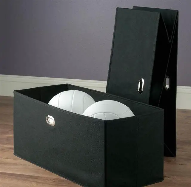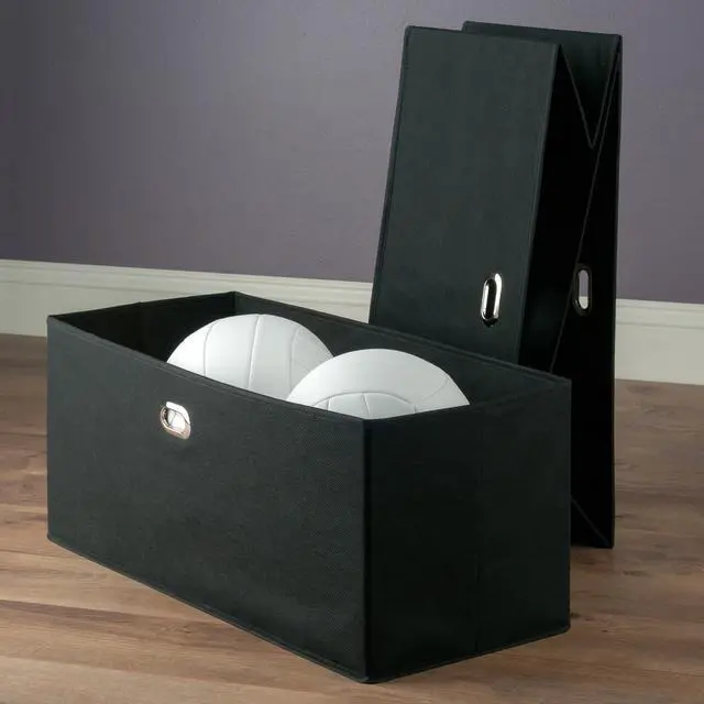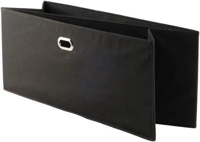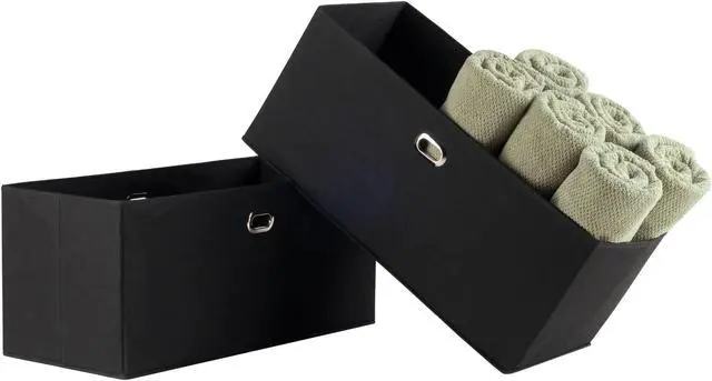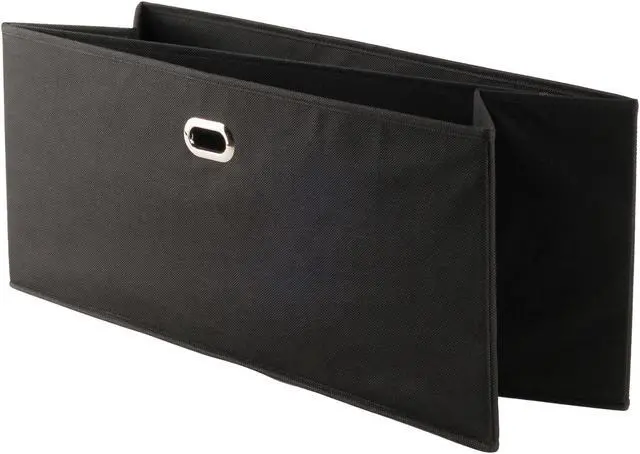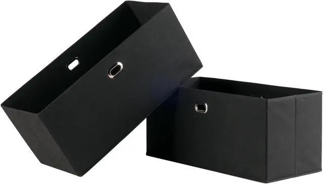 Keep your shelves organized and looking great with the 2-piece Torino Baskets. Store everything from sweaters, shoes, and towels to toys and games in these foldable fabric baskets. With a 10.2" depth, they fit easily on any closet shelf or freestanding shelf unit. Carrying them is easy and secure with metal ring handles. Made of fiberboard reinforced black fabric, these foldable baskets are a perfect organizational tool. Open size 233"W x 10.2"D x 10.2"H. Fabric is 100% Non-woven Polypropylene, and is reinforced with fiberboard for durability.