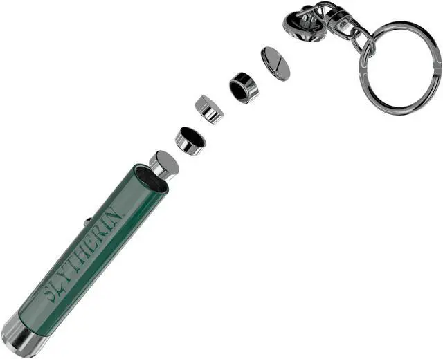 Touch and mini-projector. It works by pressing the button: if pointed in the direction of a surface it projects the symbol of the Hogwart houses, Gryffindor or Slytherin. It can also be used as a keyring.