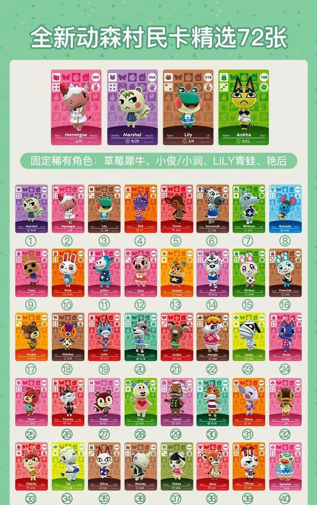 50 RV cards: the same function as the villager card, only the animals are different (in the 3ds version, the RV can be brushed to sell furniture, the ns version is an island, so there is no such function) 18 hand-made cards: you ca n’t settle, you can take photos and get posters, including 16 16 + 1 cards for Darandou villagers and 1 card for Daxidou villagers This is 72pcs villager cards pick up from 400 villager cards 72pcs/pack Animal Crossing Series Customized Amiibo NFC TAG Cards These tag cards are able to be used on your Switch/Wii U. Tested and work perfect. NO Figure, NFC tag only. Works perfectly in Animal Crossing Series. These NFC tag cards are written with the data to assist game function. You can brush out the characters you want and invite to live in the village. Also you can take pic with some of the characters or invite them to visit and live in your village.
