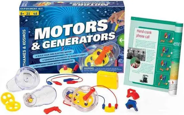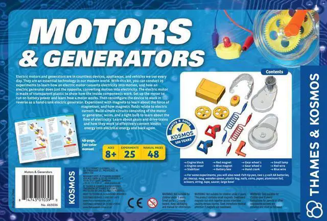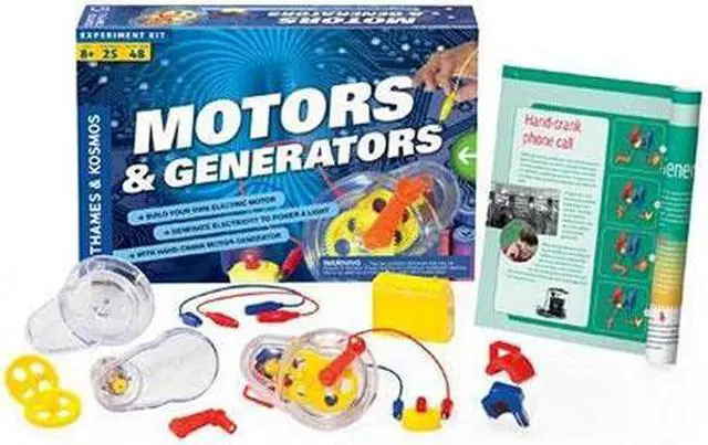 Electric motors and generators are in countless devices, appliances, and vehicles we use every day. They are an essential technology in our modern world. With this kit, you can conduct 25 experiments to learn how an electric motor converts electricity into motion, and how an electric generator does just the opposite, converting motion into electricity.