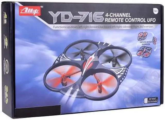 This quadcopter comes with a specially design canopy provides protection to the blades. 4 channel function provide stable flying and easy operation. A high capacity battery and powerful motor enable the helicopter to fly much longer and faster. USB cable makes charging more convenient.Features:Quadcopter design•4-channel remote control•3-axis flight control•2.4 GHz wireless technology•Two (2) high capacity batteries•User repairable•Charges via USB •Four extra props included•Remote control distance: 100m/328-ft•Remote control powered by three (3) AAA batteries (not included)Unit Dimensions: •1.18 x 4.13 x 4.13-inches (H x W x D)Weight: 1.19 ozPackage Includes:•YD-716 4CH 3-Axis Remote Control Quadcopter•Remote control•Two (2) rechargeable batteries•Four (4) extra rotor blades•USB cable•User Guide