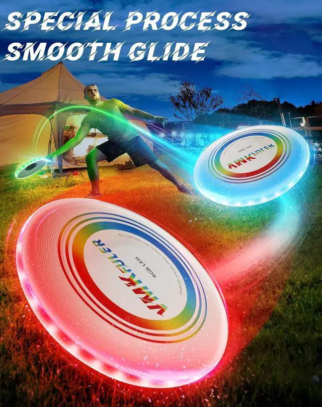 • Glow-in-the-Dark Magic Experience the mesmerizing display of the Flying Disc equipped with 37 RGB LED lights. Choose between red, green, blue, or tricolor to light up any game. Ideal for night outdoor sports, this disc ensures you always make the perfect "Dark Catch."