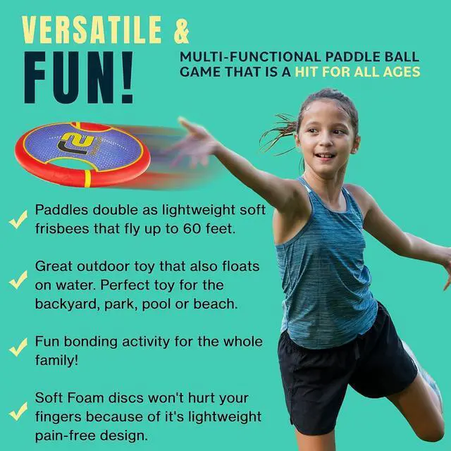 : Our paddle game is also a safe and durable frisbee that offers superior construction over the competition. Inspected for quality before it leaves our door, this game set is made with soft, lightweight EVA foam ensuring safety for kids of all ages. The frisbees and two balls will bounce off anything or anyone without leaving a mark.