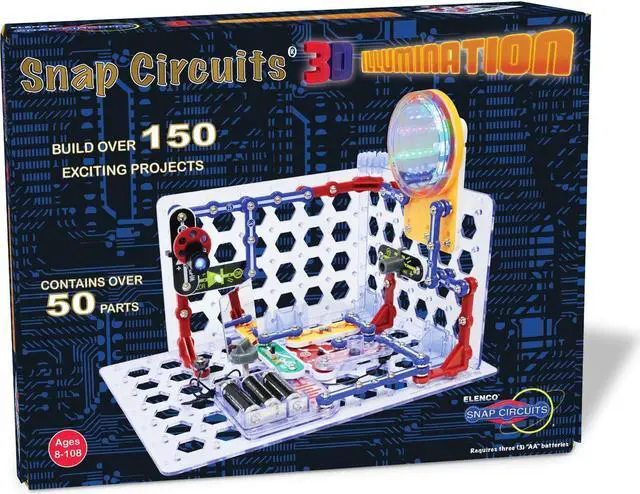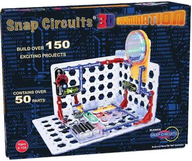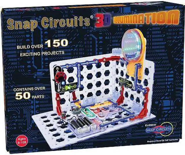 Taking Snap Circuits to a whole new dimension Up...Out...and Over! Build over 150 projects or combine with other Snap Circuits sets to build even more unique structures.The Elenco Snap Circuits 3D Illumination Set Features:Exciting light effects3-color light tunnelProjector with 6 cool imagesComes with over 50 partsWith new parts like the vertical stabilizer, base grid stabilizer, and base grid support, you can build amazing 3D structures!