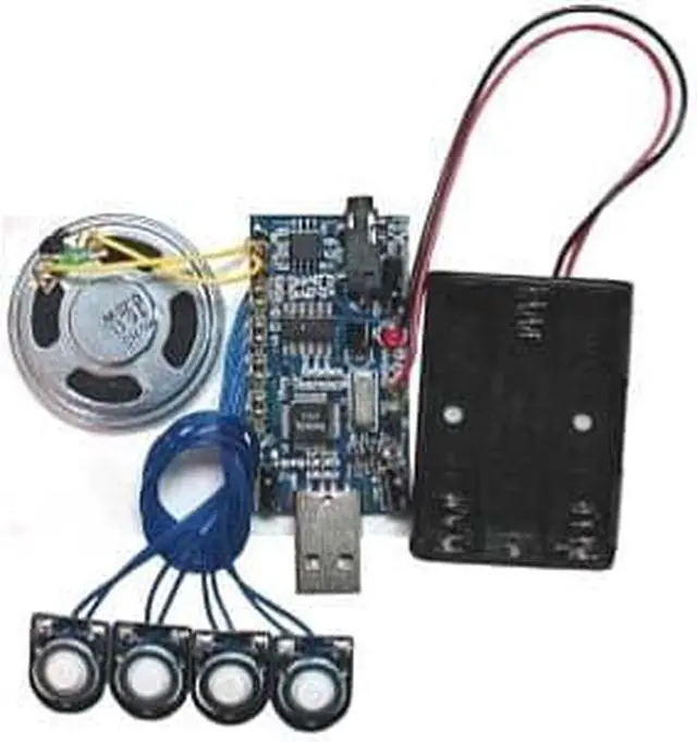 This module plugs directly into the USB port of your PC. Then use the free software to record up to 300 seconds of .wav files to this module. Comes with a speaker and a line out for an additional amplifier or external speakers.
