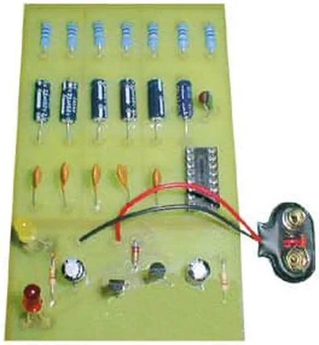 Special kit designed for the student who has not had any experience with soldering. This kit has 30 components to solder in giving the student ample soldering experience. The first 20 components to be soldered are used to gain soldering experience but the last 10 components when soldered in make up a bright red and yellow alternating LED flasher! The LED flasher portion is built after the student has soldered in the 20 practice components which include: capacitors a transistor resistors and an IC socket.