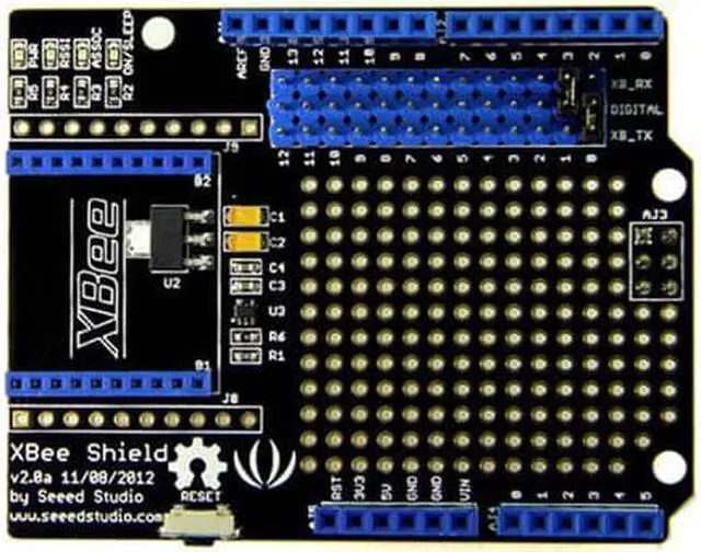 The new version of XBee Shield is a standardized and stackable shield compatible with Arduino. You can easily stack any modules from the Bee series onto it and build a wireless network for your project. In spite of that it is also equipped with function of level conversion which enables a doubleway conversion between high & low IO levels. The reserved digital pins facilitate users to select TX/RX port using jumper caps.