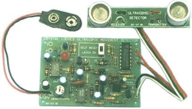 The circuit uses a matched pair of 40Khz transducer elements to detect movement out to about 22 feet. You may add a relay (not included) to switch a heavy appliance etc.; the unit switches just an LED as supplied. The circuit can be switched to latch on. An ideal alarm circuit that cannot be easily fooled.