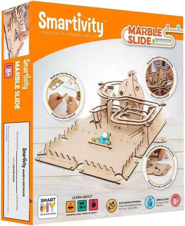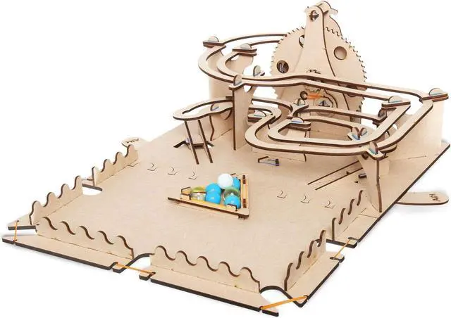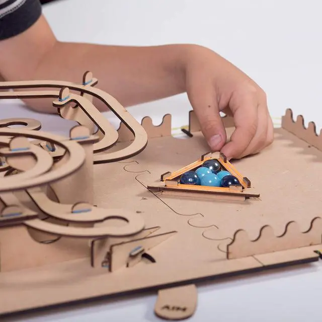 A mashup of marble slide and billiards or pooltable game this project is loads of fun to build and play. Based on the fundamentals of gravity centrifugal force and banking this buildityourself kit is project and game all in one! After assembling the marble slide and the base play the game! Set the colored marbles on the billiards table. Insert the white marble into the wheel roll the wheel to move the marble to the top and release. As the marble slides down the track use the levers on each side to aim the marble to strike the other marbles and knock them into the corner or side pockets. Play games with friends and keep score. Or experiment by moving the levers and changing the angle of the marble strike. Decorate with your own paints and markers and make it unique!