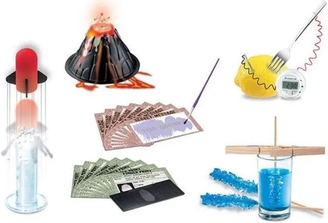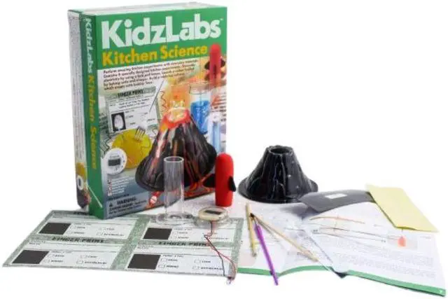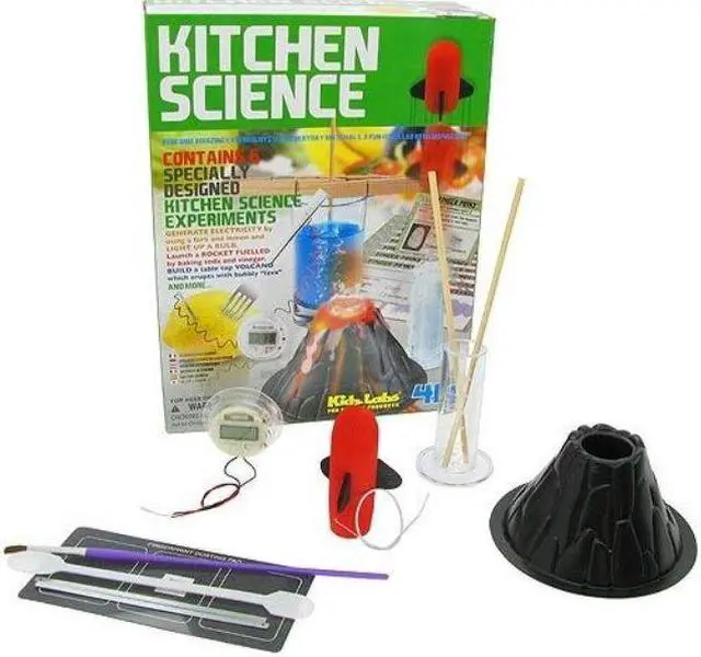 Use everyday kitchen materials to fuel 6 different science experiments.Make a volcano erupt with lava Launch a bakingsoda or even use a fork & tomato to power a light bulb!