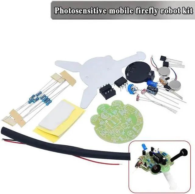 LED Breathing Light Simulated Firefly Flashing Robot Photosensitive Sensor Mobile Robot Soldering DIY Kit This kit simulates firefly robot. The antenna on the head of firefly can sense the existence of light. When the light shines on the left and right antenna R1 or R4 triode Q1 or Q2 will turn on and the motor installed on the leg will vibrate and firefly will move. and the breathing lamp circuit is made up of LM 358 OPAMP 1C which simulates the luminous effect of fireflies slowly turning on and off.In the dark environment just like real fireflies it embellishes the world.through the welding assembly of this kit can understand some basic electronic components improve handson ability is a good choice for beginners. Power Supply Voltage: DC 3vInduction device: Photosensitive resistorPower Source: 3v Flat motorTail light: 5MM blue LED