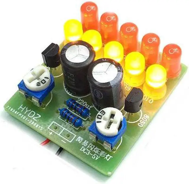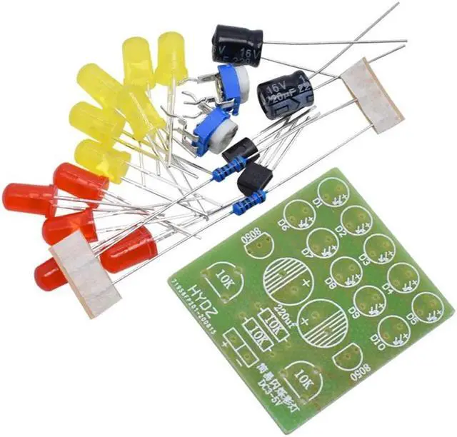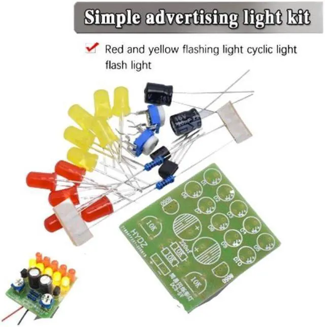 Simple advertising LEDs kit red and yellow flashing LEDs solding DIY Kit Simple advertising lights by lightemitting diodes capacitors transistors potentiometers and other commonly used electronic components. Circuit power supply voltage 35v. When the power supply is connected the two triodes in the circuit will take turns to lead and cut off and two groups of LED will keep circulating changing the resistance of RP1 and RP2 can change the flashing speed of the LED. Power supply voltage DC 35v