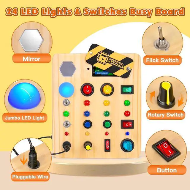 Light Up Busy BoardLight up switch board toy includes 12 different coloured and sized lights + 12 buttons, knob switches, plugs and mirror. Needs 2 AAA Batteries (Not Included)