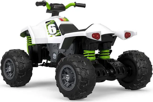 - Battery-powered ride-on vehicle with realistic ATV style; Includes 3 buttons green means go, yellow is slow down, and red turns you in reverse