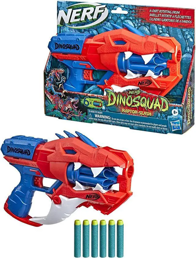 NERF DINOSQUAD RAPTOR-SLASH BLASTER: Fire into ferocious fun with this dart blaster that features awesome dinosaur details, capturing the look of a Velociraptor dinosaur