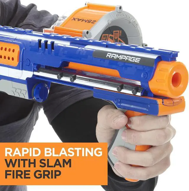 Includes Rampage body, drum connector, 25-dart drum magazine, 25 Elite Darts and instructions
