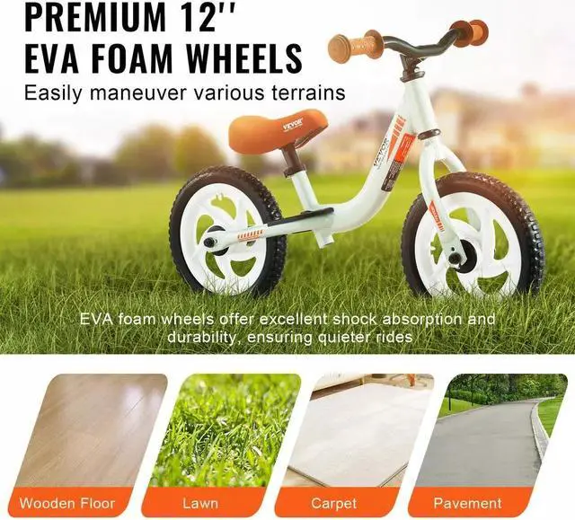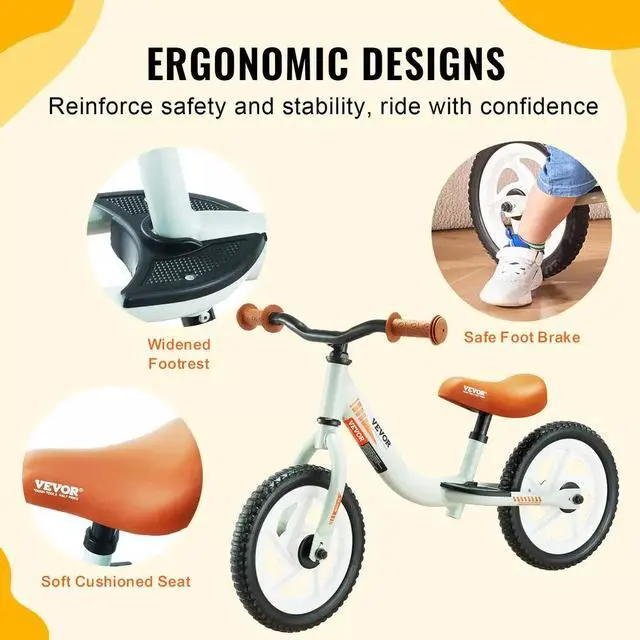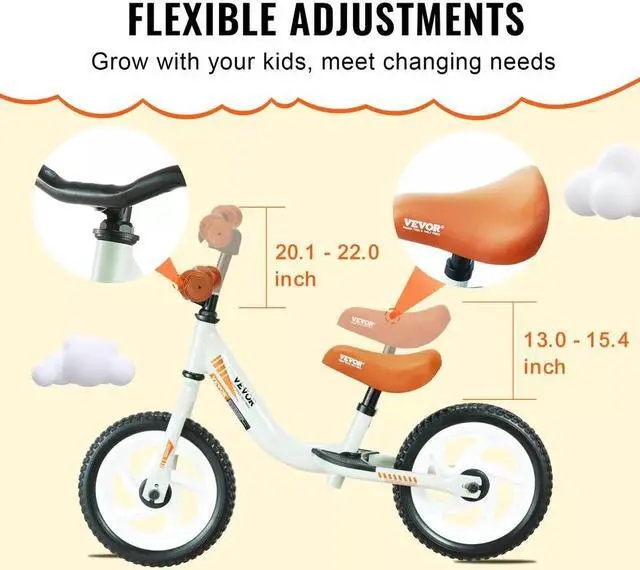 1. The perfect companion for kid's growth journey, VEVOR toddler balance bike promotes physical development while providing endless fun. With 55.1LBS high loading, aluminum alloy frame, and adjustable seat & handlebar, it ensures comfort and safety, ideal for children aged 1-5 years.