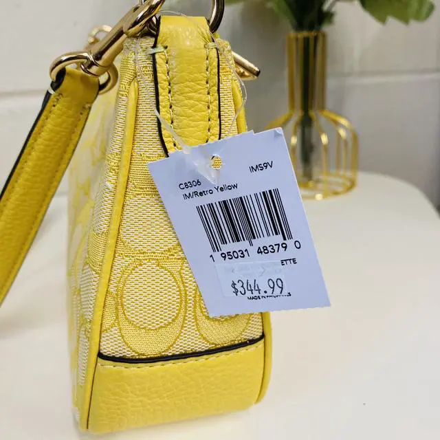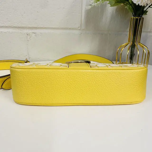 Coach C8306 Lonnie Baguette In Signature Jacquard In Gold/Retro Yellow Signature jacquard and refined pebble leather Inside multifunction pocket Zip-top closure, fabric lining Detachable handle with 8 1/4" drop Detachable strap with 22" drop for shoulder or crossbody wear 9 3/4" (L) x 5 3/4" (W) x 2 3/4" (W) Style No.