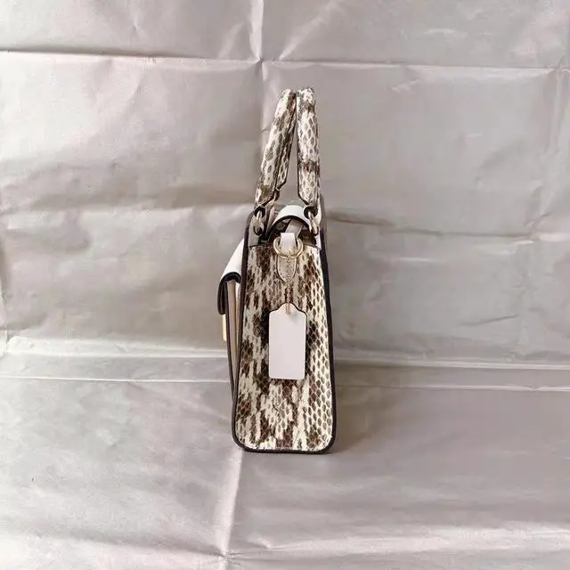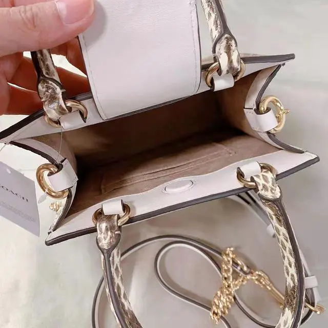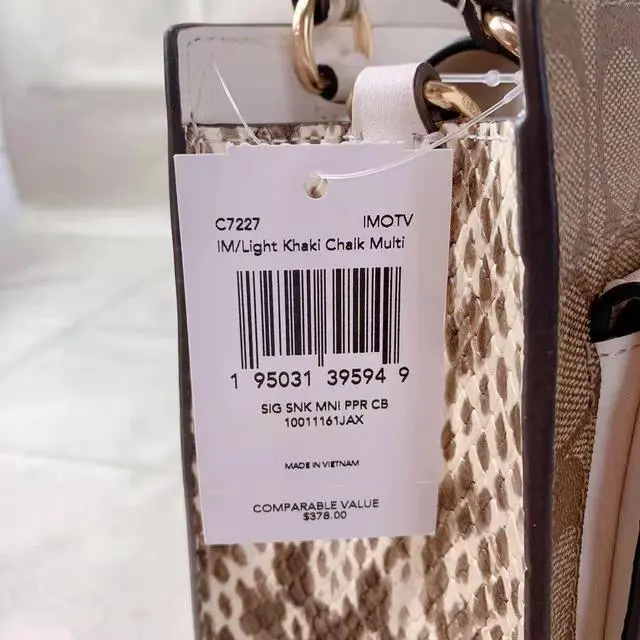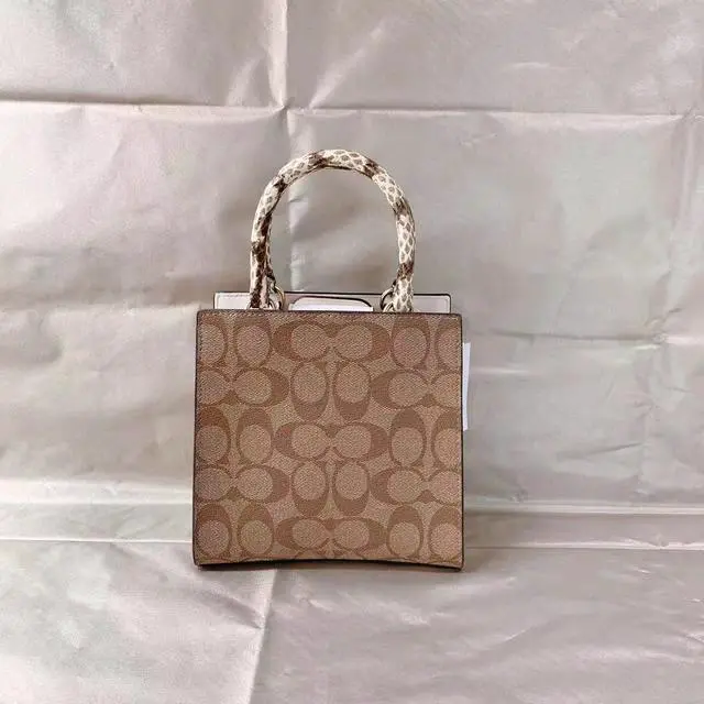 Coach C7227 Mini Pepper Crossbody In Signature Canvas In Light Khaki Chalk Multi Signature coated canvas, smooth leather and snake-embossed leather Two credit card slots Inside multifunction pocket Magnetic snap closure, fabric lining Handles with 3 3/4" drop Outside flap pocket Detachable strap with 23 1/2" drop for shoulder or crossbody wear 6 3/4" (L) x 6 3/4" (H) x 3" (W) Style No.