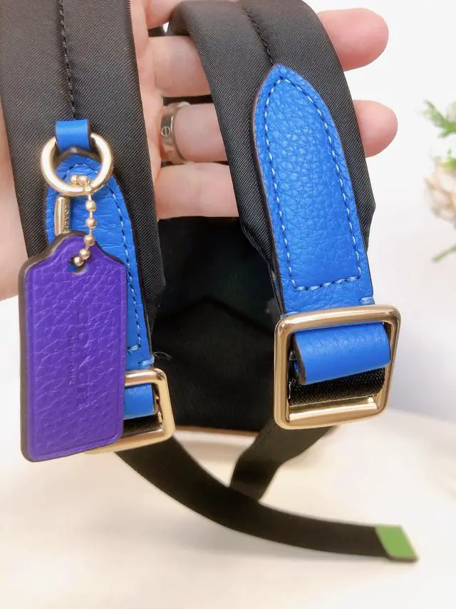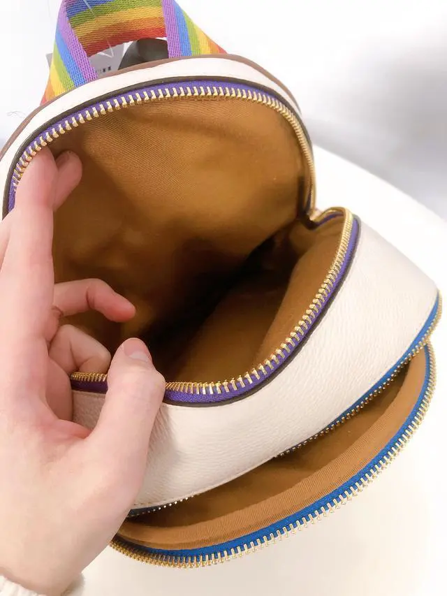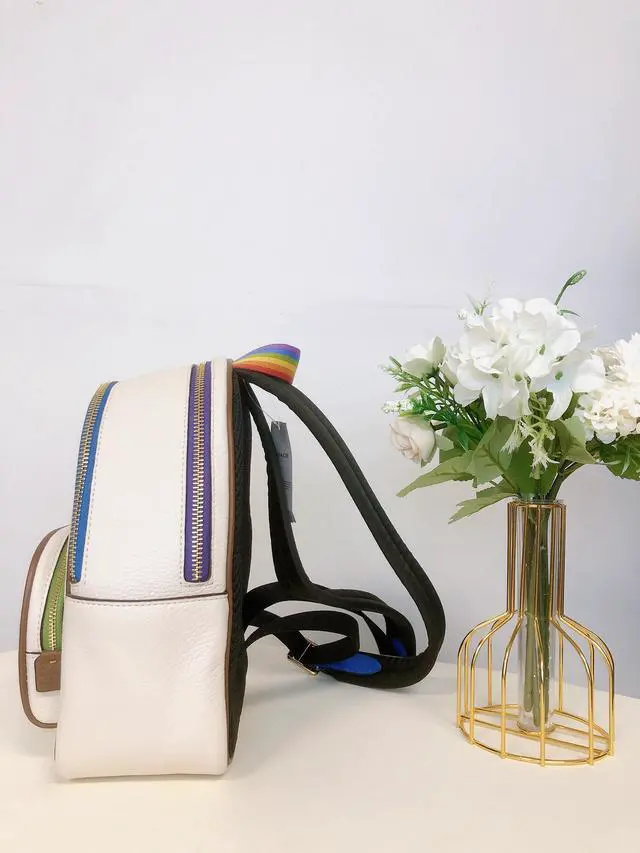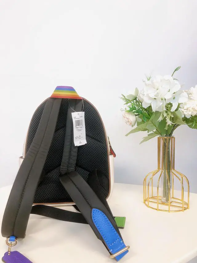 Coach CA624 Mini Court Backpack With Rainbow Coach In Gold/Chalk Multi Refined pebble leather Inside zip and multifunction pockets Double zip closure, fabric lining Handle with 1 1/2" drop Outside zip and open pockets Adjustable shoulder straps 8" (L) x 9" (H) x 3 1/2" (W) The Coach Foundation continues to partner with the Hetrick-Martin Institute, Point Foundation and CenterLink Community of LGBTQ Centers to create supportive environments where LGBTQIA+ young people can thrive. To learn more, visit coach. com/DreamItReal. Style No.