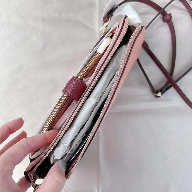 Coach C5368 Noa Pop Up Messenger In Colorblock In Brass/Light Coral Multi Polished pebble leather Four credit card slots Full-length bill compartment Inside multifunction pockets Zip coin pocket Zip-top and turnlock closures, fabric lining Detachable strap with 23" drop for shoulder or crossbody wear 8 1/4" (L) x 4 1/2" (H) x 1 1/2" (W) Style No.