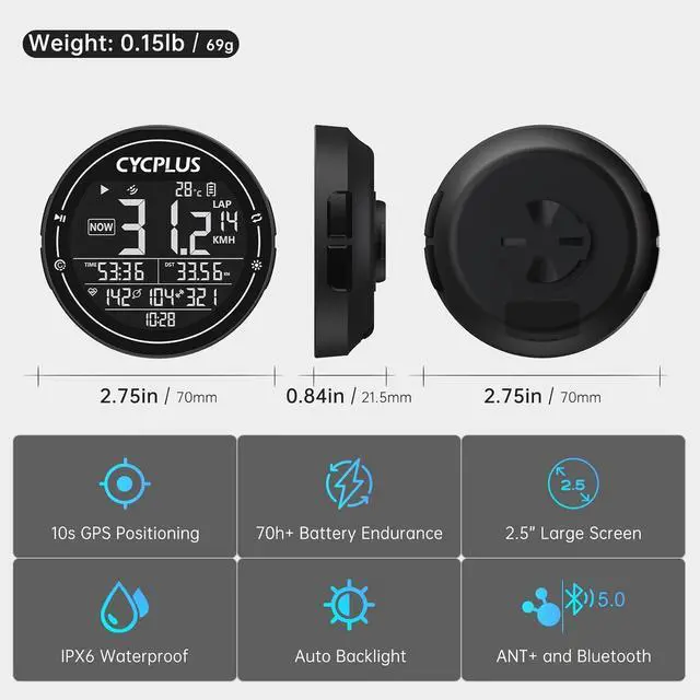 CYCPLUS GPS Bike Computer, Wireless Cycling Computer, ANT+ Bluetooth Bicycle Speedometer Odometer IPX6 Waterproof, Rechargeable with 2.5 Screen for Bikers Outdoor Cycling (New Upgraded)