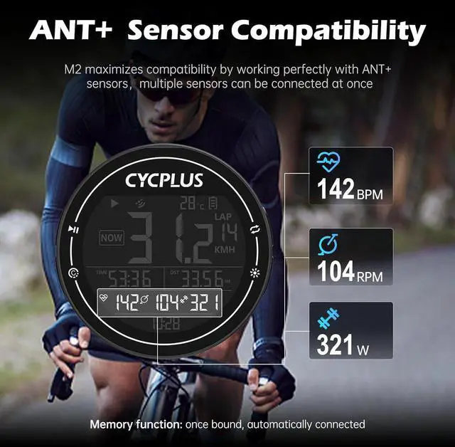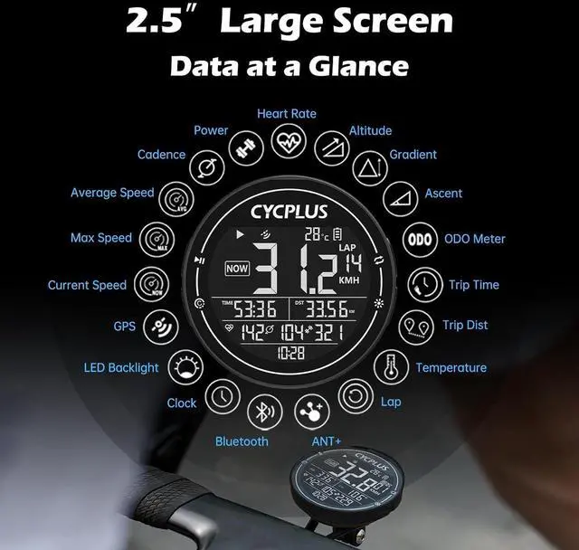 ALL DATA YOU NEED The GPS bike tracker has up to 12 different data displayed on 3 tables(switchable) including Odometer, Current Speed, Max Speed, Average Speed,Cadence, Heart Rate, Ascent, Power, Altitude, Gradient and etc., and is compatible with all ANT+ devices