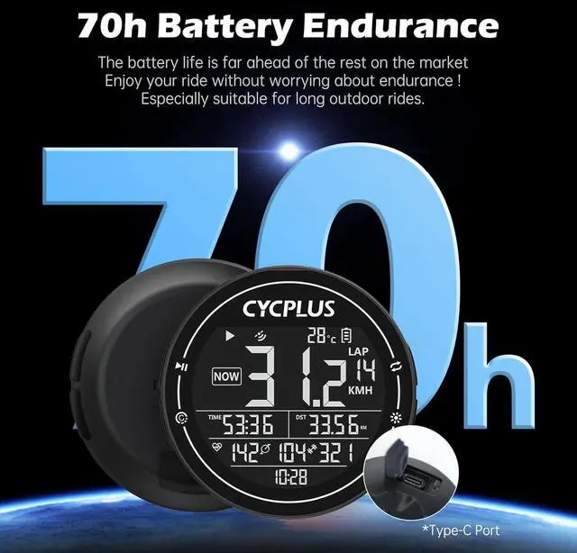 READY FOR A LONG RIDE The cycling computer is equipped with a 1000 mAh lithium battery, which can support 70 hours of use on single full charge. IPX6 waterproof allows you to enjoy riding even in rainy weather